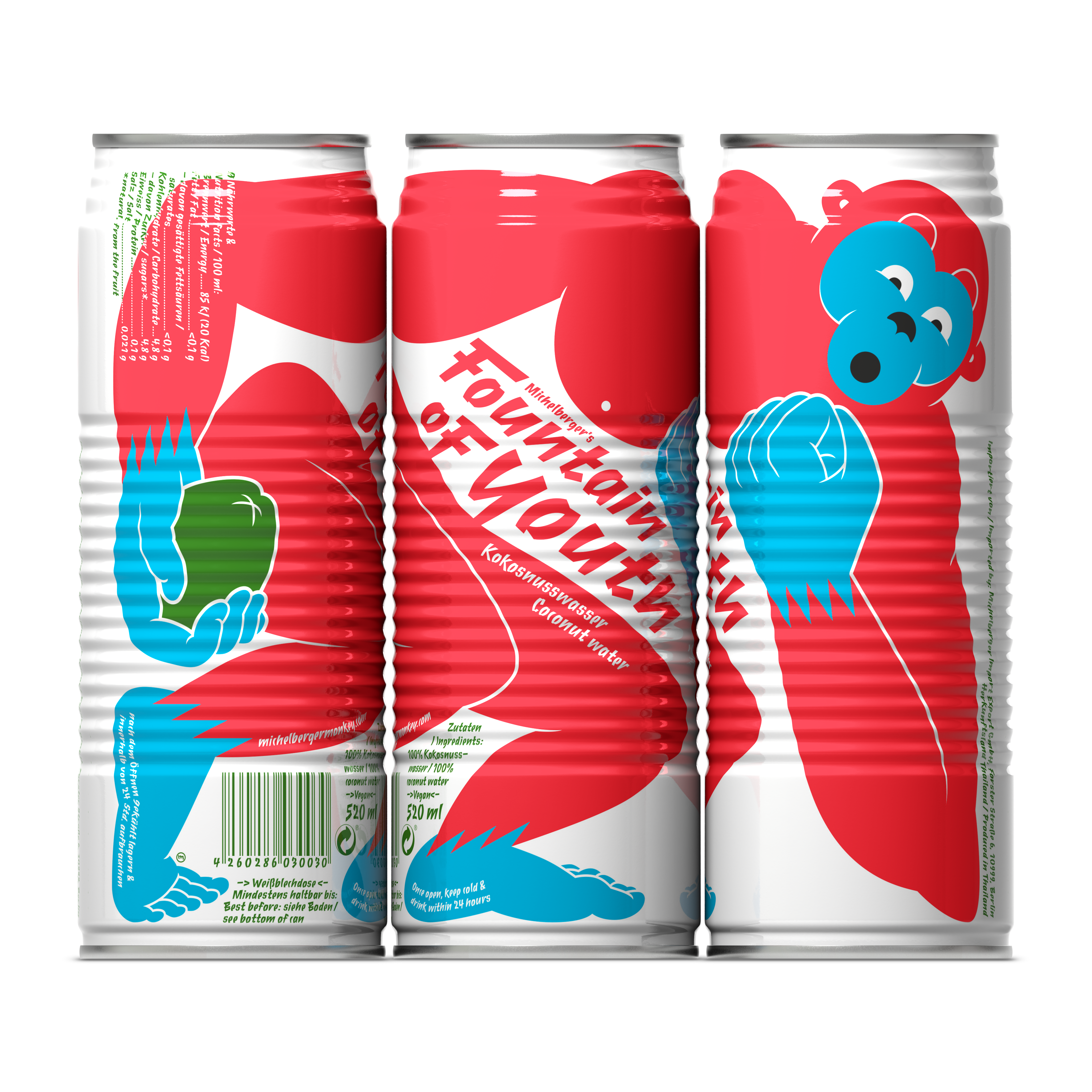 The Fountain of Youth är ett dryckesvarumärke från Michelberger Hotel i Berlin. Sedan starten 2012 har det vuxit stadigt och finns nu i 15 länder. Själva drycken produceras i Thailand, där unga, gröna Nam Hom-kokosnötter odlas på småskaliga gårdar i Ratchaburi-regionen. Kokosvattnet tappas utan tillsatser eller konserveringsmedel och förpackas direkt efter skörd för att bevara smaken och fräschören. Resultatet är ett naturligt sött kokosvatten fullt av elektrolyter som kalium och magnesium. Varje burk innehåller vätskan från ungefär två unga kokosnötter. Det är ett fräscht alternativ för att fylla på med vätska, oavsett om du har tränat, är på språng eller bara vill dricka något gott och naturligt. Kokosvattnet är gott att dricka som det är, gärna väl kylt. Det fungerar också utmärkt i drinkar och mixas fint med till exempel matcha, kallbryggt kaffe eller rom, lime och salt. The Fountain of Youth drivs som ett oberoende och småskaligt projekt. Fokus ligger på smak, transparens och goda relationer snarare än tillväxt för sin egen skull.